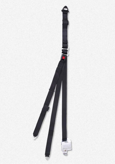 Integrated Combination Belt with triangular fittings to attach lap belt to stud on rear wheelchair tie-down retractor assemblies. Height Adjuster provides nearly 12” of vertical adjustment to allow proper shoulder belt placement on the occupant. A Velcro strap is provided to keep belt against the vehicle sidewall when not in use.